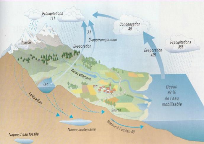 La préfecture du Doubs a été dans l’obligation de prendre un arrêté de restriction des usages de l’eau dans 110 communes du Haut à compter du 29 juillet 2022 et dans les autres communes du Doubs dont Grandfontaine à partir du 10 août pendant 3 mois. Le déficit de précipitations aggravé par les fortes températures a desséché les sols et dégradé les débits des rivières avec un niveau des nappes phréatiques qui continue de baisser. C’est tout le cycle de l’eau qui est actuellement perturbé (schéma ci-dessous).