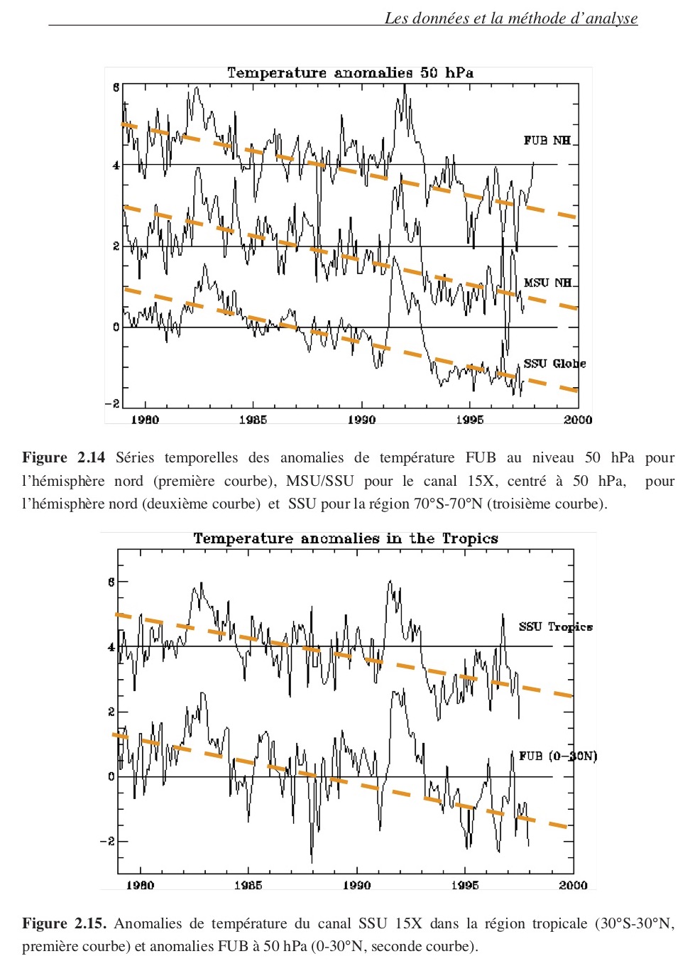 Ces 5 courbes montrent une tendance à la baisse de la température de la stratosphère sur 20 ans dans plusieurs régions du globe et par différentes techniques de mesure.